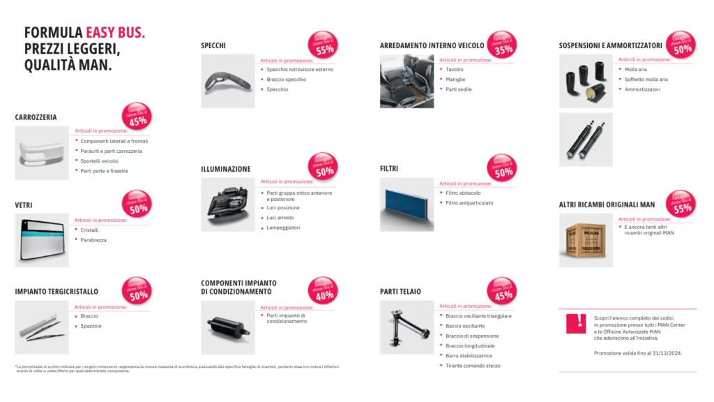 Per un periodo limitato, Truck Florence ti offre sconti esclusivi su una selezione di ricambi originali MAN, con il vantaggio di una garanzia estesa di 2 anni. Questo significa che, oltre ad ottenere il massimo della qualità, puoi godere della sicurezza di un servizio affidabile e duraturo nel tempo. Inoltre, la Formula Easy Bus è valida presso tutte le Officine Autorizzate MAN e MAN Center che aderiscono all’iniziativa, garantendoti così l’assistenza qualificata di tecnici esperti e l’utilizzo di attrezzature all’avanguardia per la diagnosi e la riparazione del tuo veicolo.