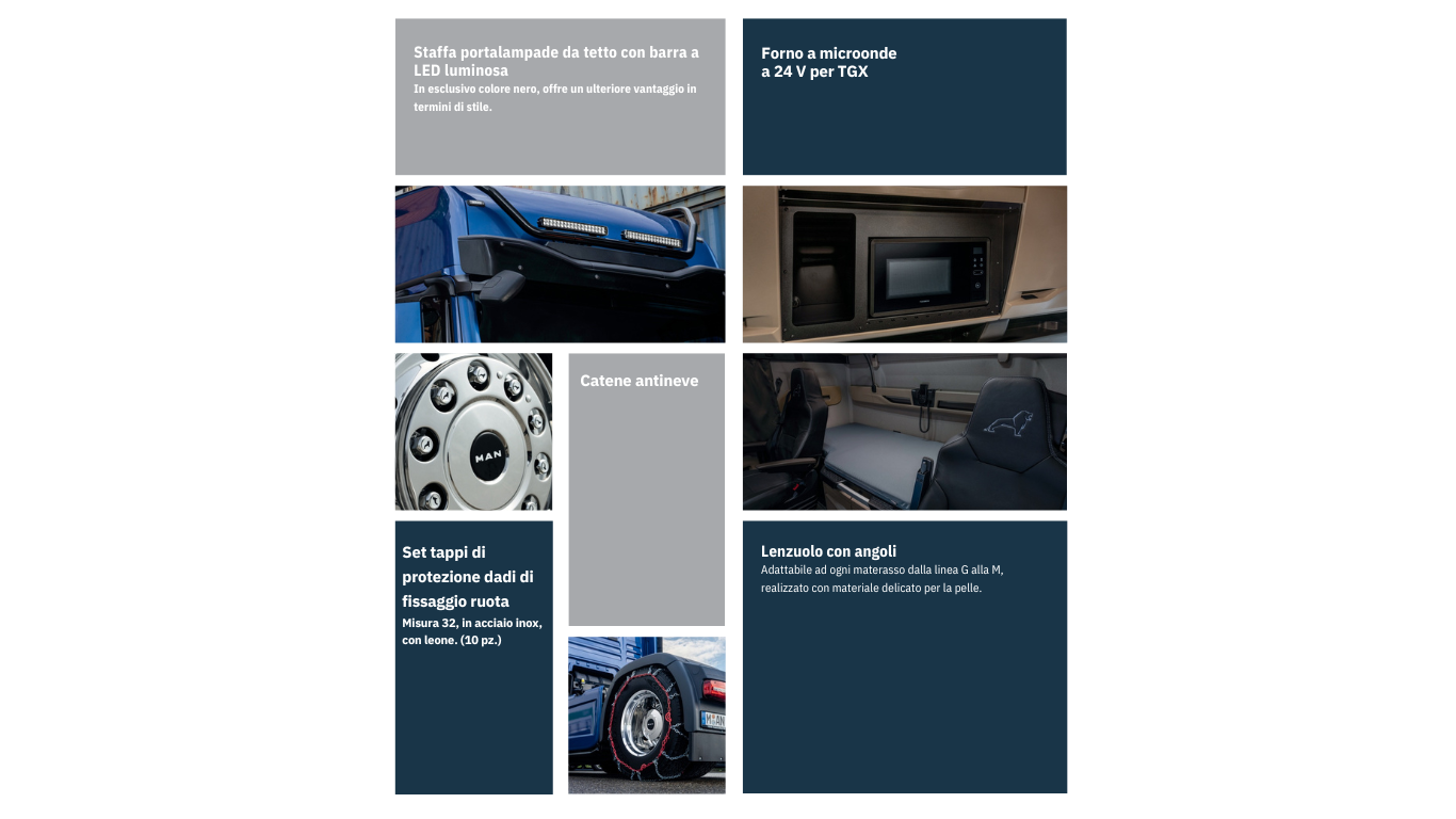Non dimenticare di personalizzare il tuo veicolo con gli accessori originali MAN, per aumentare ulteriormente la tua sicurezza e il tuo comfort.